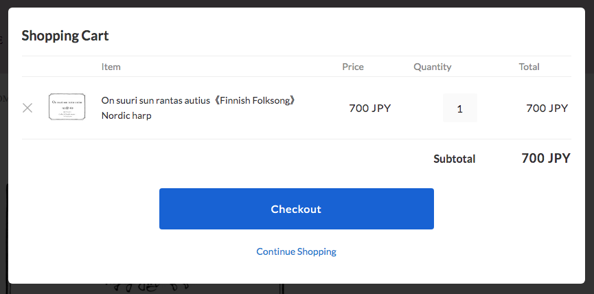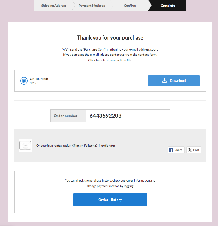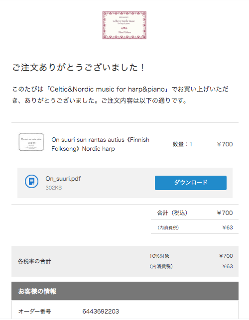 1. Shopping Cartから「Checkout」をクリックします ![]() 2. 右上のプルダウンから日本語を選択してください ![]() 3. ご購入者さま情報を記入してください ![]() 4.「お支払い情報の入力へ」をクリック ![]() 5. お支払方法を選択し「内容のご確認へ」をクリックしてください ![]() 6. クレジットカードの場合は情報を記入して下さい ![]() 7.オーダーが完了したら下記の画面になります。 「Downlord」をクリックしてデータを保存してください。 ![]() 8. メールアドレスに下記のメールが届きます。 注文履歴(order history)からもダウンロードしていただけます。 ![]() |